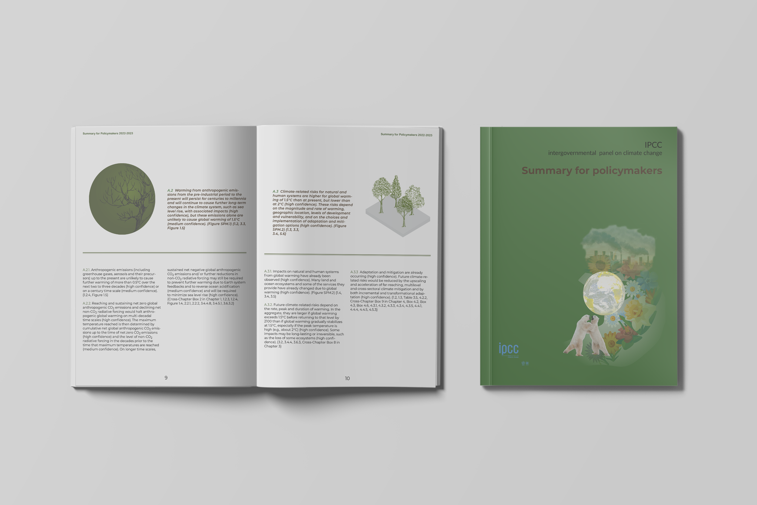 Global warming impacts the colour of the earth. Researchers suggest that much of the ocean surface will be bluer and greener due to rising global temperatures on phytoplankton or microscopic marine algae containing chlorophyll and needing sunlight to live and grow. Because of these impacts, using a dark green for the cover background is the best fit. A collage picture with two polar bears fighting for food, and the colour changed on the globe, florals on a transparent grey path due to the factories producing a massive amount of smoke, aggravating the temperate.